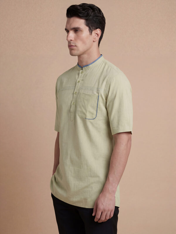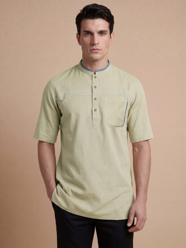 Jade green color poly cotton jacquard men short kurta